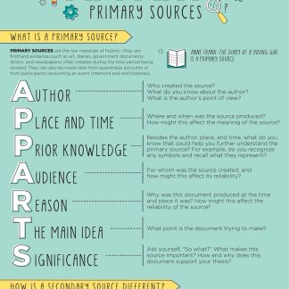 What is a primary source? How do you properly analyze it? How is a secondary source different? Students will answer these questions and more with the APPARTS poster! Aligns to Common Core and C3 Standards A tested pre-AP and AP strategy for primary document analysisCopyright 2017. Middle school, high school. 19 x 27 inches. Laminated to last.