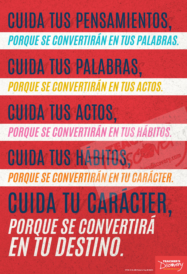 How you think determines who you are and who you’ll become! That’s the message this inspiring mini-poster delivers to your students.Take care with your thoughts,they become your words.Take care with your words,they become your actions.Take care with your actions,they become your habits.Take care with your habits,they become your character.Take care with your character,it becomes your destiny.13 x 19 inches. Cardstock.