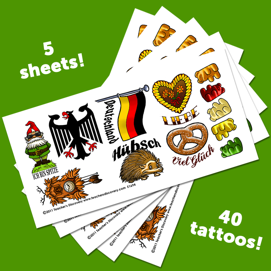 From a cute hedgehog and a cool gnome to a heart that says “liebe/em,” these temporary tattoos are going to go over big with your German students! Five sheets of eight designs, assortment of 40 tattoos in all, instructions on the back of each sheet. Each design measures over one inch across. If the “ink” needs to come off early, a little rubbing alcohol does the trick.