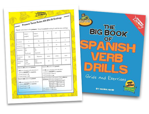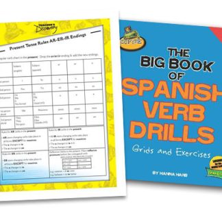 SERIOUSLY. This is the MOST complete, MOST teacher-friendly collection of Spanish verb drills and student exercises ever compiled for classroom use! Handy conjugation charts visually demonstrate verb usage and rules. The book’s 24 chapters are packed with dozens of exercises, including verb grids, sentence correction, incorrect usage recognition, crossword puzzles, fill-in-the-blank sentences and word matches–plus teacher answer keys. And just for fun, we’ve thrown a few fake verbs into the mix for students to find and define! The verb drills cover regular, irregular, stem-changing and reflexive-AR/em, -ER/em, and-IR/em verbs in the following tenses/forms: Present Preterite Commands Imperfect Future Conditional Present Subjunctive Past Subjunctive Present Participle (Gerund) Present Progressive Past Progressive Direct and Indirect Object Pronouns Gustar/em Copyright 2010. Spanish, English. All levels. Reproducible. 441 pages. Book Download: PDF. Print Book: Three-ring binder. 10 x 12 inches. Loose-leaf paper. 8 x 11 inches.