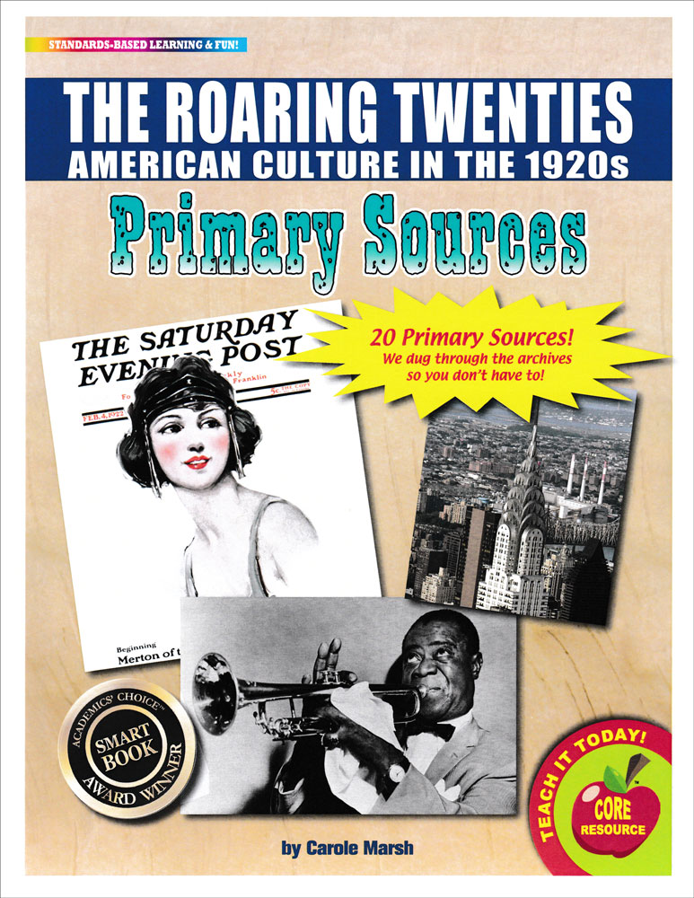 The Roaring Twenties (American Culture in the 1920s) Primary Sources/em are just what teachers need to help students learn how to analyze primary sources in order to meet Common Core State Standards!Students participate in active learning by creating their own interpretations of history using historical documents. Students make observations, generate questions, organize information and ideas, think analytically, write persuasively or informatively, and cite evidence to support their opinions, hypotheses, and conclusions. Students learn how to integrate and evaluate information to deepen their understanding of historical events.The 20 Primary Source documents in The Roaring Twenties (American Culture in the 1920s)/em include: Photograph of young immigrants at Ellis Island, New York–circa 1915dash;1920 Political cartoon depicting the women’s suffrage movement in the United States–the 19th Amendment was passed in 1920, giving women the right to vote–1917 Copy of advertisement for a Ford touring car in Farmers/em Magazine/em–1920 Photograph of Major League Baseball superstar Babe Ruth and political cartoon depicting national interest in his accomplishments Newspaper advertisement for the Kelvinator refrigerator–electric refrigerators began to replace ice boxes in the early 1900s–ad published 1920 Self-portrait by Walt Disney used on his business envelopes as he began his career as a cartoonist–1921 Photograph of New York City police commissioner watching agents pour liquor into a sewer after a raid during Prohibition–1921 Cover page for song ;ldquo;I’m Just Wild About Harry;rdquo; from the Broadway show Shuffle Along/em–first financially successful Broadway play with African American writers and an all-African American cast–1921 Saturday Evening Post/em magazine cover titled ;ldquo;The Flapper;rdquo;–1922 Photograph of Ford Motor Company assembly line–Henry Ford’s assembly line concept revolutionized the manufacturing industry–1923 Photograph of President Calvin Coolidge throwing out a baseball at a Major League Baseball game–Calvin Coolidge served as the 30th U.S. president from 1923 to 1929–photo taken 1924 Photograph of women tuning a radio–listening to radio in the 1920s was an exciting new form of entertainment–circa 1925 Photograph of Langston Hughes and the words to his poem ;ldquo;Mother to Son;rdquo;–Hughes was a leader of the Harlem Renaissance in New York City Entertainer Josephine Baker performs the Charleston, a popular dance during the Roaring 20s–1926 Photograph of Charles Lindbergh in front of his airplane, Spirit of St. Louis/em–Lindbergh is famous for completing the first transatlantic flight–1927 Copy of movie poster for The Jazz Singer/em–its release signaled the growth of sound films and ended the silent film era–1927 Photograph of crowd outside the New York Stock Exchange after the stock market crash–1929 Photograph of a workman on the framework of the Empire State Building–builders competed to build the tallest skyscraper in New York City in the 1920s–photo taken 1930 Photograph of jazz musician Louis Armstrong–1952 Photograph of the Chrysler Building in New York City–example of the Art Deco movement–photo taken 2005Your students will: Think critically and analytically, interpret events, and question various perspectives of history. Participate in active learning by creating their own interpretations instead of memorizing facts and a writer’s interpretations. Integrate and evaluate information provided in diverse media formats to deepen their understanding of historical events. Create a more relevant and meaningful learning experience.span style=”color:#FF0000;”Download the Gallopade Free Online Teacher’s Guide for Primary Sources PDF located in ;ldquo;Additional Info.;rdquo;/spanAll levels. 8 x 11 inches each. Cardstock.