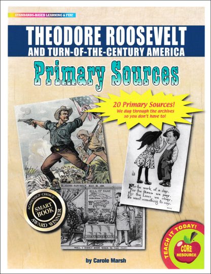Theodore Roosevelt and Turn-of-the-Century America Primary Sources/em are just what teachers need to help students learn how to analyze primary sources in order to meet Common Core State Standards!Students participate in active learning by creating their own interpretations of history using historical documents. Students make observations, generate questions, organize information and ideas, think analytically, write persuasively or informatively, and cite evidence to support their opinions, hypotheses, and conclusions. Students learn how to integrate and evaluate information to deepen their understanding of historical events.The 20 Primary Source documents in the Theodore Roosevelt and Turn-of-the-Century America/em include: Cover of Puck/em magazine showing Theodore Roosevelt leading the Rough Riders into battle against the Spanish in Cuba during the Spanish-American War–1898 Political cartoon satirizing the concept of American imperialism at the turn of the century–1898 Sheet music cover for ;ldquo;Dawn of the Century;rdquo; March and Two Step–depicts optimism about a better future through progress in technology–1900 Photograph of a woman dressed in male attire and smoking a cigarette supervising a man doing laundry–depicts the changing role of women–1901 Artist’s conception of the shooting of President William McKinley at the Pan-American Exposition–McKinley later died of his wounds and Theodore Roosevelt became president–1901 Political cartoon depicting President Roosevelt’s ;ldquo;Big Stick;rdquo; foreign policy: ;ldquo;Speak softly, and carry a big stick.;rdquo;–1904 Cover of Judge/em magazine showing Theodore Roosevelt wearing an allegorical crown of the Panama Canal, ;ldquo;the greatest achievement for trade in modern times;rdquo;–1904 Political cartoon depicting a Standard Oil tank as an octopus wrapping its tentacles around steel, copper, and shipping industries, as well as the U.S. Capitol and the White House–1904 Photograph looking down Sacramento Street in San Francisco after the 1906 earthquake–1906 Photograph of Orville Wright flying the 1908 Flyer at Fort Myer, Virginia–1908 Political cartoon featuring the many roles Theodore Roosevelt filled during his lifetime–1908 Editorial cartoon depicting President Roosevelt’s conservation policies to protect wilderness and wildlife–1908 Political cartoon depicting Uncle Sam, George Washington, and Theodore Roosevelt greeting the Great White Fleet as the ships returned to Virginia after a cruise around the world–1909 Photograph depicting an example of child labor in early 1900s–children working as spinners in a Mississippi yarn mill–1911 Photographs of the RMS Titanic/em–the British passenger liner sank in the North Atlantic Ocean after hitting an iceberg in April 1912 Postcard depicting sentiments of the women’s suffrage movement–1913 Poster urging citizens to remember people killed on the RMS/em Lusitania/em and enlist in the military–the British ocean liner was sunk by a German U-boat in 1915–the sinking was a factor influencing the United States to enter World War I in 1917–poster dated 1915 Photograph of Mount Rushmore National Memorial in South Dakota–the sculpture features George Washington, Thomas Jefferson, Theodore Roosevelt, and Abraham Lincoln–photo taken 2010Your students will: Think critically and analytically, interpret events, and question various perspectives of history. Participate in active learning by creating their own interpretations instead of memorizing facts and a writer’s interpretations. Integrate and evaluate information provided in diverse media formats to deepen their understanding of historical events. Create a more relevant and meaningful learning experience.span style=”color:#FF0000;”Download the Gallopade Free Online Teacher’s Guide for Primary Sources PDF located in ;ldquo;Additional Info.;rdquo;/spanAll levels. 8 x 11 inches each. Cardstock.