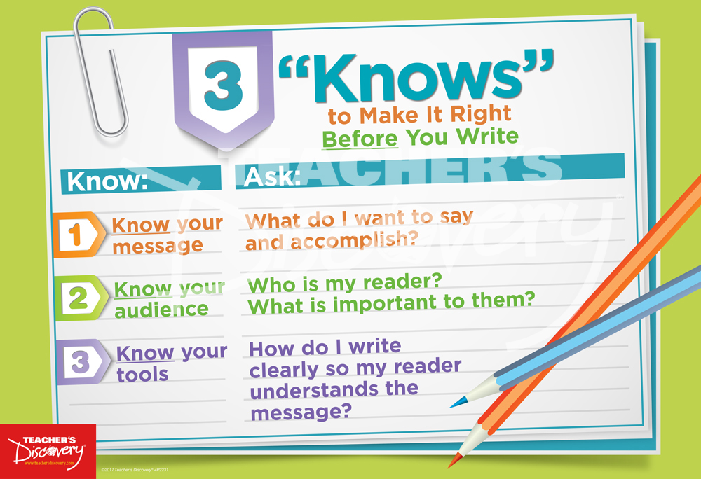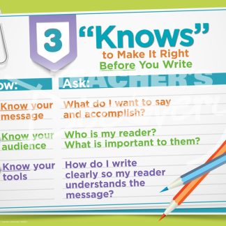 Remind your students to stop and consider three simple tips before they write to focus their thoughts–and their writing.Copyright 2017. 19 x 13 inches. Cardstock.