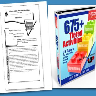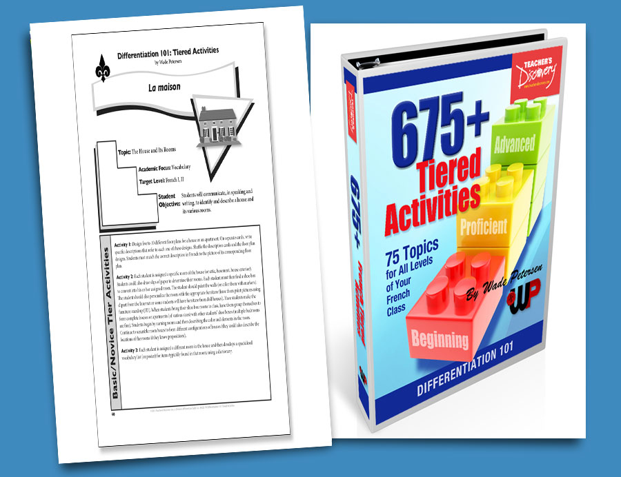 p style=”color: #ff0000;”span style=”color: #000000;”Tiering starts with the end product in mind! What is it that you want your students to be able to do with a particular set of vocabulary or a particular grammar point? Some of your students will be lucky to learn a tricky conjunction. Some of your students will be able to take this concept a bit further, and others will be able to use this in a way that will make your head spin! No matter how far some students take the skill, there are the basic core concepts that you must teach and that all your students need to master. This is what 675+ Tiering Activities does by adjusting the degree of difficulty of a particular task to match various students’ level of readiness. With over 675 Tiered Activities covering 75 topics with three levels (Basic, Proficient and Advanced), this book will address all of the skill levels within your World Language class. /spanCopyright 2013. French, English. All levels. Reproducible. 170 pages. Book Download: PDF. Adobe Reader required to view PDF. Print Book: Three-ring binder. 10 x 12 inches. Loose-leaf paper. 8 x 11 inches. img alt=”” src=”//aedownload.net/teachersdiscovery/images/Author_Wade_Petersen.jpg” style=”float: left; border-width: 0px; border-style: solid; margin: 0px 6px; height: 150px; padding-right: 10px;” /About the Author Wade Petersen has been teaching in Iowa for 30 years. He has taught French I, II, III, IV; freshman English; A.P. Composition; A.P. Literature; American literature; world literature and creative writing. He earned his B.A. in French and English from Northwestern College. During his undergraduate years, he studied at theAlliance Fran;ccedil;aisein Paris. In 2001, he earned his master’s degree in Effective Teaching, Learning, and Leadership from Drake University.Petersen has been the recipient of many prestigious awards and has served in leadership roles within the Iowa World Language Association. Petersen’s presentations continue to earn rave reviews, which include being named ;ldquo;Best of Iowa;rdquo; four times. He presents various workshops throughout the U.S. and serves as a keynote speaker at state conferences.Wade Petersen has published over 40 products with Teacher’s Discovery. His best-selling materials are creative, useful, and practical for any classroom. Wade’s publishing philosophy clearly connects with his motto that;ldquo;Creativity Speaks Volumes.;rdquo;