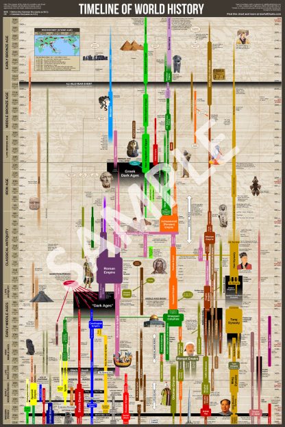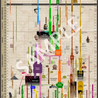 Over 100 major empires, kingdoms and civilizations are displayed in a colorful synchronistic (side-by-side) format so that one can quickly see how different events in different places relate to each other and get a broad sense of the general “flow” of history.More than 500 facts are displayed, including:Famous peopleImportant achievementsMajor warsSpecific eras of human developmentNatural disasters and more!On the main chart, the names of each century (e.g. third century CE) are included alongside the dates (e.g. 200-300 CE) in order to avoid any confusion and, unlike many other timelines, the units of time remain equidistant in order to provide a proper comparison between ancient empires and modern ones.A conscious effort has also been made to make the chart less Eurocentric than other popular (but now terribly outdated) timelines and thus what was happening in India, China, Africa, and the Americas is shown alongside what was happening in the Middle East and Europe.This poster was fully revised and updated in 2014 and as such represents 21supst/sup-century scholars’ current knowledge of the past – for example, potential linkages between Indo-European groups are shown as well as several newly discovered cultures such as the Oxus Civilization.spanCopyright 2014. 24 x 36 inches. Printed on glossy paper. Middle/high school. /spanspanISBN: 978-0987729323/span