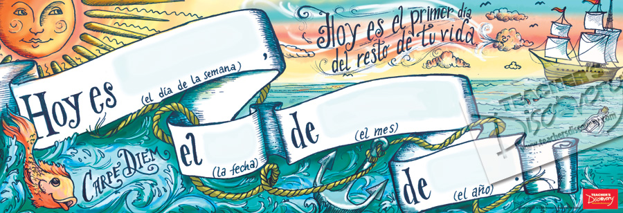 Write in the day of the week, date, month, and year on this gorgeous dry-erase perpetual calendar! Spanish. All levels. 13 x 38 inches. Laminated. brbrPlease Note…To get the longest life from this dry-erase poster:- Do not leave the same writing on the poster for weeks or months. Erase posters when they are not in use, or change what is written on them often.