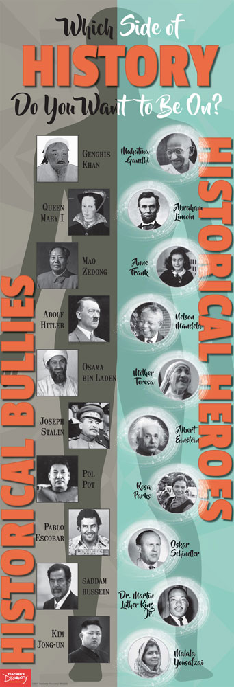 Are history’s heroes free from fault? Are history’s bullies completely corrupt? Use this poster as a teaching tool to discuss the themes of bullying and perspective in your class!Copyright 2017. All levels. 13 x 38 inches. Laminated to last.