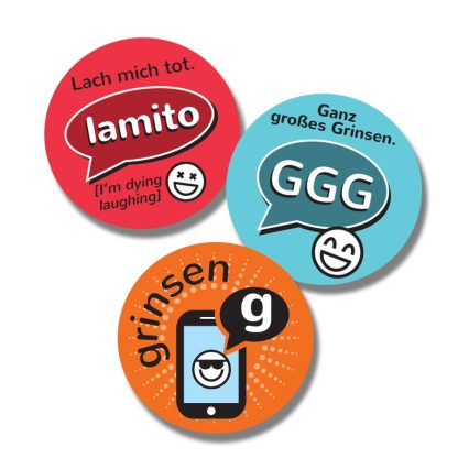 Since your students love to abbreviate things and are always trying to be funny, they are sure to love getting a ;ldquo;lamito/em;rdquo; (Lach mich tot./em) or a ;ldquo;GGG/em;rdquo; (Ganz gro;szlig;es Grinsen/em) from you. Three sheets of 20 assorted full-color stickers, for a total of 60 stickers. Each round sticker measures approximately 1 inch across.