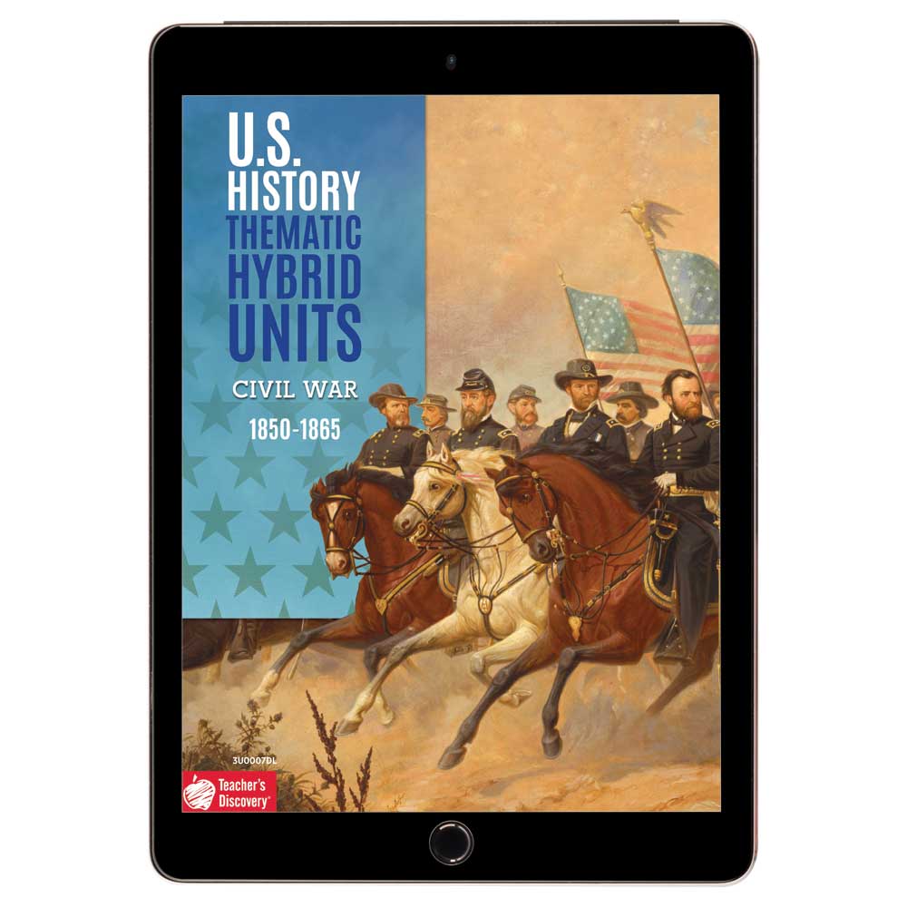 This versatile digital resource is an entire thematic unit in one place! PDFs include complete teacher edition and editable student pages. Students simply type their answers in, save, and upload! Printable and projectable, this unit is perfect for seamless teaching in class, at home, or any combination! Flexible design works in any learning environment, ready to upload to Google Classroom or any other learning platform! Differentiated and supportive, with a solid mix of warmups, out-of-the-box activities, content and skills practice, graphic organizers, primary source analysis, and resources. Activities include: Easy Debate: How Would You Propose to Keep the Union Together?, SHOW ME Challenges and Clues: Civil War, Historical Speech Analysis of Abraham Lincoln’s ;ldquo;Gettysburg Address,;rdquo; and Document-Based Questions: Brother Against Brother. Ready to implement! No textbook, no problem. A historical context reading with bolded key vocab terms starts the unit. Aligned to C3 and Common Core national standards.Middle school, high school. Reproducible. PDF download, 100 pages.