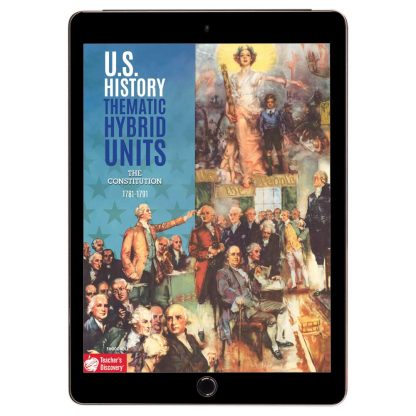 This versatile digital resource is an entire thematic unit in one place! PDFs include complete teacher edition and editable student pages. Students simply type their answers in, save, and upload! Printable and projectable, this unit is perfect for seamless teaching in class, at home, or any combination! Flexible design works in any learning environment, ready to upload to Google Classroom or any other learning platform! Differentiated and supportive, with a solid mix of warmups, out-of-the-box activities, content and skills practice, graphic organizers, primary source analysis, and resources. Activities include: Easy Debate: What Is the Most Important Principle of the Constitution?, Document-Based Questions: Challenges of a New Nation, and Document-Based Questions: The Constitution. Ready to implement! No textbook, no problem. A historical context reading with bolded key vocab terms starts the unit. Aligned to C3 and Common Core national standards.Middle school, high school. Reproducible. PDF download, 65 pages.