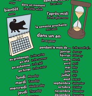 Put this poster up in your classroom to supply your students with tons of ways to answer the question, “When?” in French. 13 x 38 inches. Laminated to last forever.