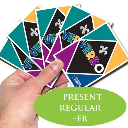 Verbo/ in French! We’ve taken one of our favorite classroom card games and adapted it for your first-year French class. Verbo/ plays like UNO;#8482;. Students practice verbs and verb conjugation by laying down a card of the same verb or verb form to change suit. Just don’t forget to shout “Verbo!” when you have one card left! 77 cards per deck. 3-6 players.Verb List: chanter, danser, d;icircer, ;eacute;couter, jouer, parler, pr;eacute;parer, regarder, travailler/em