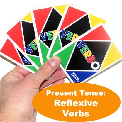 Verbo is our version of one of the world’s most popular card games! A Michigan Spanish teacher’s creation, Verbo reinforces verb forms and helps students recognize different conjugations! The game plays just like UNO. All the rules remain the same except that players change suit by laying down a card of the same verb or verb form instead of using colors and numbers. Just don’t forget to shout “Verbo!” when you have one card left! 72 cards. Laminated. Three to six players. Intermediate. Verb List: levantarse, lavarse, batilde;arse, despertarse, sentarse, acostarse, divertirse, vestirse, peinarse/em