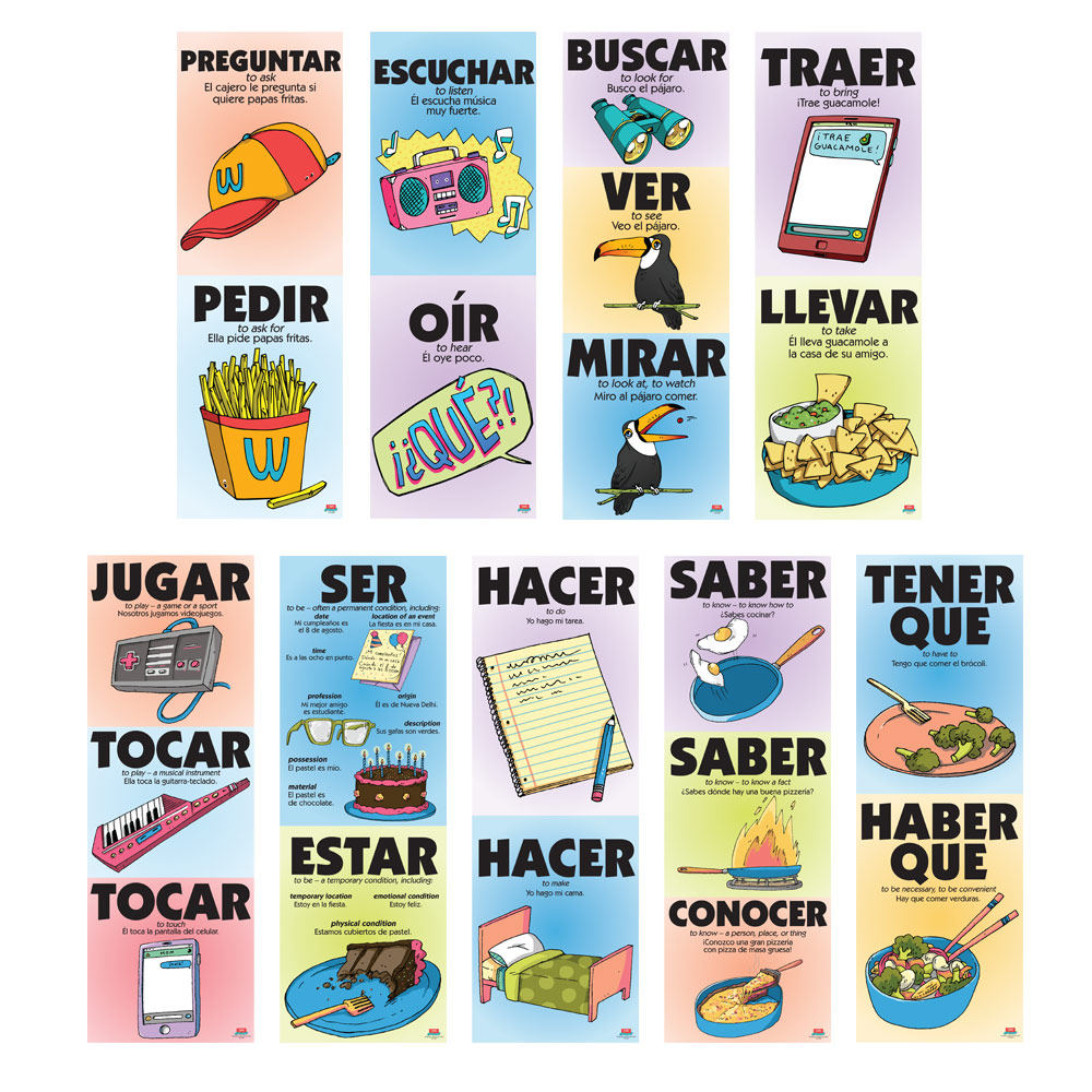 Set includes: Ser /emand estar/em Tener que/em and haber que/em Jugar /emand tocar/em Saber /emand conocer/em Hacer/em Preguntar /emand pedir/em Escuchar /emand o;iacute;r/em Buscar/em, ver/em, and mirar/em Traer /emand llevar/emCopyright 2017. Set of nine posters. 13 x 38 inches each. Laminated.