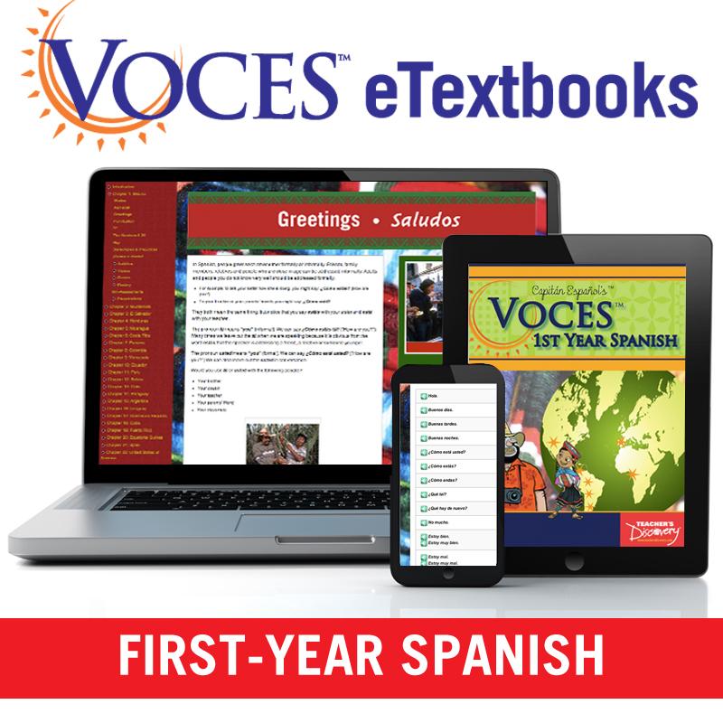 Voces Spanish Novice/ is a revolutionary digital resource that takes a modern, interactive approach to teaching new languages.br/br/Voces Spanish Novice builds students’ language skills through engaging digital workbook activities, presentations, games, and videos. Students will learn new vocabulary words and conversation skills, as well as the real-world traditions and cultures of Spanish-speaking countries. br/br/Languages were never meant to be learned out of a book. They are meant to be learned through hearing and speaking. Because Voces utilizes tools like video, clickable audio pronunciation of vocabulary words, and realistic language mastery exercises, your students will become comfortable communicating in Spanish in no time. br/br/span style=”font-size:1.3em; font-weight:bold;”Voces Spanish Novice includes:/spanbr/li style=”padding-bottom:0px;”Voces native speaker interviewsli style=”padding-bottom:0px;”ACTFL Can-Do Statementsli style=”padding-bottom:0px;”Clickable vocabulary with native speaker audioli style=”padding-bottom:0px;”Interpretive tasks using authentic resourcesli style=”padding-bottom:0px;”Real-life interpersonal and presentational speaking tasksli style=”padding-bottom:0px;”Simulated conversations modeled after AP testsli style=”padding-bottom:0px;”360;deg; panoramas with see/think/wonder-style question setsli style=”padding-bottom:0px;”Automatic grading, recording, and playback features li style=”padding-bottom:0px;”Over 200 videosli style=”padding-bottom:0px;”Practice activities, mastery exercises, and quizzesbr/span style=”font-size:1.3em; font-weight:bold;”The Voces Platform/spanbr/Applicable to all Voces titles.br/li style=”padding-bottom:0px;”Compatible with PC, Mac, iPad, iPhone, and all other devicesli style=”padding-bottom:0px;”Web-based platformli style=”padding-bottom:0px;” downloading requiredli style=”padding-bottom:0px;”Auto-grading capabilityli style=”padding-bottom:0px;”Audio and videoli style=”padding-bottom:0px;”Student recording feature*li style=”padding-bottom:0px;”Easy-to-use Teacher’s Panel with student data management*li style=”padding-bottom:0px;”Content customization*li style=”padding-bottom:0px;”Voces Mail**Student setup required.br/br/Try Voces Spanish Novice in your classroom today, and see the difference! a “https://www.vocesdigital.com/trialreg.php” target=”_blank” style=”color:#fe5621; text-decoration:underline;”Click here for a FREE 10-day Trial.//abr/br/span style=”font-size:large; font-weight:bold;”Want more information? Call Voces;reg: at 800-848-0256/spanbr/