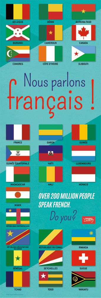 From Canada to Cameroon, Senegal to Switzerland, by over 200 million people in countries spread over five continents, French is spoken! Poster: 13 x 38 inches. Laminated. Vinyl banner: 2 x 6 feet, with grommets for easy hanging.