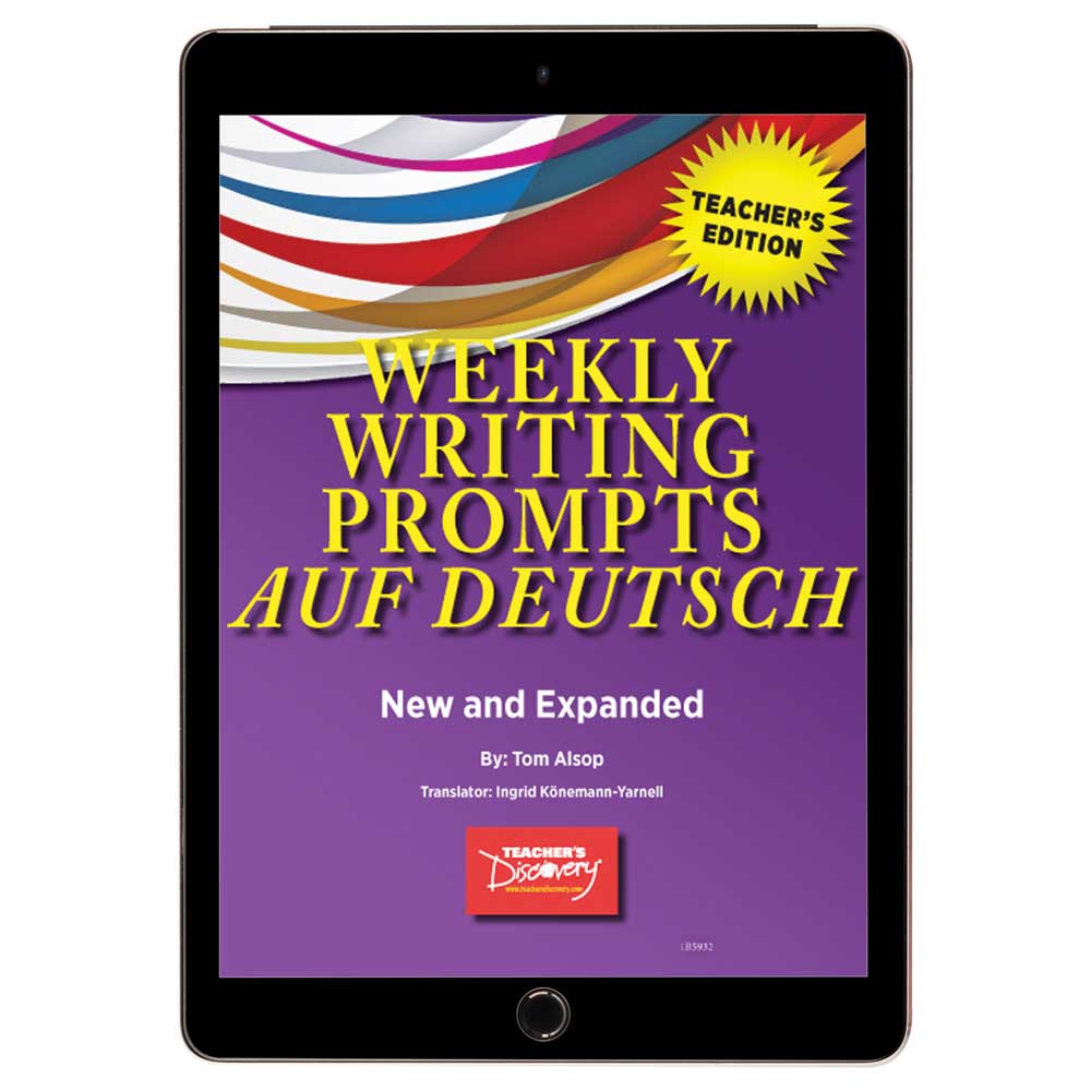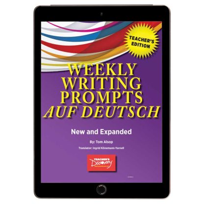 Assign one writing prompt a week–they’re designed to be in sync with the events of a teenager’s school year! Each prompt in the Teacher’s Edition introduces high-frequency vocab and teen-relevant terms, and then gives a few manageable tasks to practice the new words–such as writing a text message, an ad to sell something, a short poem, a mini-story with a particular character or setting, or a fictional conversation between two people. Exercises are easy to share with students learning remotely. Novice-level instructions are in English. Copyright 2017. German. Level 1. Novice. Middle school, high school. Reproducible. 54 pages. Book Download: PDF.Print Book: Spiral-bound with CD (PDF). 9 x 11 inches. img alt=”” src=”//aedownload.net/teachersdiscovery/images/Author_Tom_Alsop.jpg” style=”float: left; border-width: 0px; border-style: solid; margin: 0px 6px; height: 155px; padding-right: 10px;” /About the Author Award-winning teacher, presenter, and author Tom Alsop/ continues to share his many years of teaching experience through his popular Teacher’s Discovery readers, grammar books and activity books. His books provide an array of creative, student-centered, hands-on activities that allow students to actively participate in class while using the target language. Tom is a former middle school and high school Spanish teacher who now teaches Spanish at Butler University in Indianapolis. He often presents at world language conferences and leads workshops at schools around the country. He is the director of three summer Spanish teacher immersion programs (Aventura Cultural/) for high school and middle school teachers in Havana, Cuba; Madrid, Spain; and Guadalajara, Mexico.