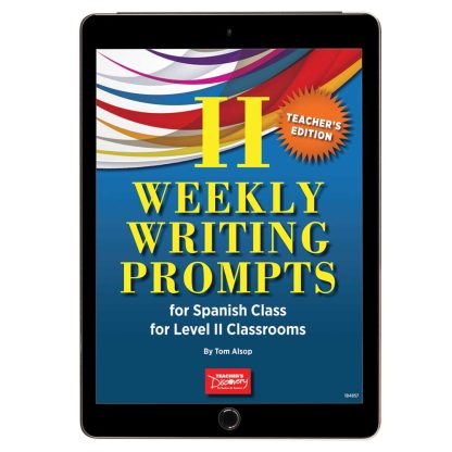 Assign one writing prompt a week–they’re designed to be in sync with the events of a teenager’s school year! Each prompt in the Teacher;#39;s Edition introduces high-frequency vocab and teen relevant terms, then gives a few manageable tasks to practice the new words–such as writing a text message, an ad to sell something, a short poem, a mini-story with a particular character or setting, or a fictional conversation between two people. Exercises are easy to share with students learning remotely. Intermediate-level instructions are in Spanish.Copyright 2016. Spanish. Level 2. Intermediate. Middle school, high school. Reproducible. 45 pages.Book Download: PDF.Print Book: Softcover with CD (PDF). 8.5 x 11 inches.The Student’s Edition is the non-reproducible version of the book, without the CD. Each student workbook is three-hole punched to fit in a binder.Copyright 2016. Spanish. Level 2. Intermediate. Middle school, high school. 45 pages each.Set of 15 Print Books: Softcover. 8.5 x 11 inches. Three-hole punched.img alt=”” src=”//aedownload.net/teachersdiscovery/images/Author_Tom_Alsop.jpg” style=”float: left; border-width: 0px; border-style: solid; margin: 0px 6px; height: 155px; padding-right: 10px;” /About the Author Award-winning teacher, presenter, and author Tom Alsop/ continues to share his many years of teaching experience through his popular Teacher’s Discovery readers, grammar books, and activity books. His books provide an array of creative, student-centered, hands-on activities that allow students to actively participate in class while using the target language. Tom is a former middle school and high school Spanish teacher who now teaches Spanish at Butler University in Indianapolis. He often presents at world language conferences and leads workshops at schools around the country. He is the director of three summer Spanish teacher immersion programs (Aventura Cultural/) for high school and middle school teachers in Havana, Cuba; Madrid, Spain; and Guadalajara, Mexico.
