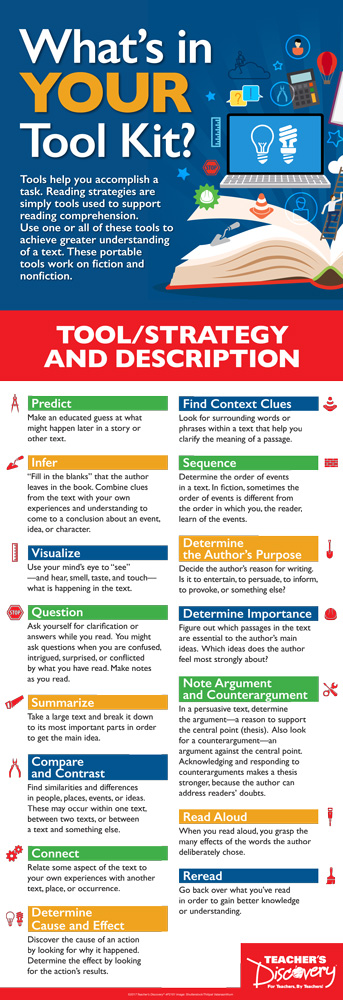 li.Reading strategies are the tools of the trade in an ELA classroom. Grab your tool kit today!Copyright 2017. 13 x 38 inches. Laminated.Pair it with the What’s in Your Tool Kit? Bookmarks/ (4E2002S30)!