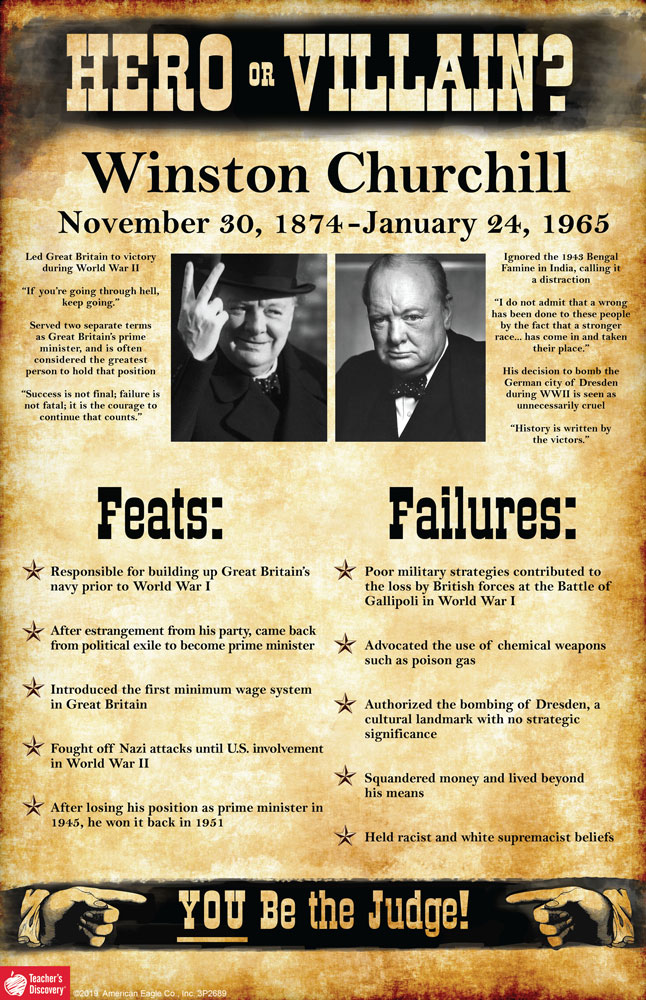 History tends to judge historical figures in extremes, and it can be tempting to view the world in black and white. Use this Winston Churchill mini-poster to encourage students to look beyond established narratives into the real world of gray.Copyright 2019. 11 x 17 inches. Cardstock.