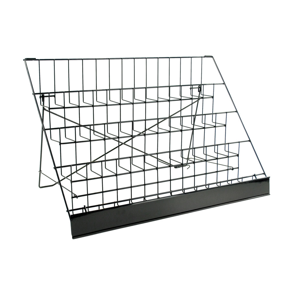Four-tiered, wire rack. Black. Folds for storage.Overall Dimensions:/ 29″ W x 17.5″ H x 14.5″ Dbr /Pocket/Shelf Dimensions:/ 25.0″ W x 5.5″ H x 2.5″ D