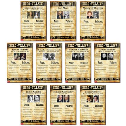 Winston Churchill was a hero! Marie Antoinette was self-absorbed! History tends to judge historical figures in extremes, and it can be tempting to view the world in black and white. These mini-posters encourage students to look beyond established narratives into the real world of gray.Set includes one of each of the following posters:3P2592 Marie Antoinette: Hero or Villain? Mini-Posterbr /3P2593 Karl Marx: Hero or Villain? Mini-Posterbr /3P2594 Margaret Thatcher: Hero or Villain? Mini-Posterbr /3P2687 Queen Victoria: Hero or Villain? Mini-Posterbr /3P2688 Mohandas Gandhi: Hero or Villain? Mini-Posterbr /3P2689 Winston Churchill: Hero or Villain? Mini-Posterbr /3P2690 Albert Einstein: Hero or Villain? Mini-Posterbr /3P2691 Indira Gandhi: Hero or Villain? Mini-Posterbr /3P2692 Mikhail Gorbachev: Hero or Villain? Mini-Posterbr /3P2693 Benazir Bhutto: Hero or Villain? Mini-PosterCopyright 2019. Set of 10. 11 x 17 inches. Cardstock.