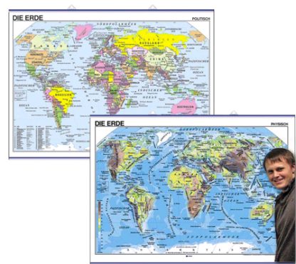 This colorful, two-sided wall map is in German and features physical characteristics on one side and political information on the other. Physical side shows mountain ranges, lakes, rivers and other geographical features. Political side shows capital and principal cities and towns. Its travel-friendly form is easily rolled and taken from room to room, with grommets for easy hanging. Map measures 54 x 38 inches. Matte, laminated stock. Made of durable, flexible, wipeable, lightweight vinyl.