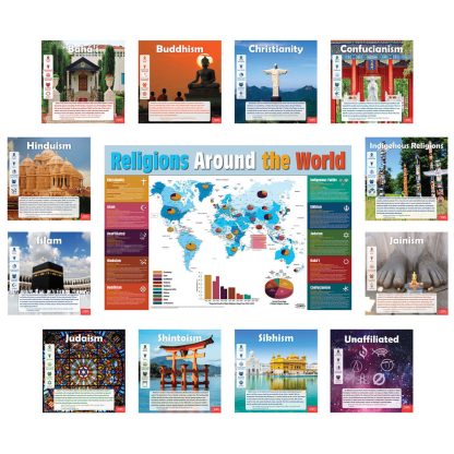 Across the globe, people of faith practice their beliefs every day. But what are those beliefs? And where do they live and worship? Discussions about a sometimes-sensitive topic become easier with the tools provided in a map, poster set, and activity packet–ready for multiple uses in your classroom.The most-practiced religions–including unaffiliated individuals and indigenous religions–are described in accessible language in the World Religions Set:/ the Religions Around the World Map, the World Religions Mini-Poster Set, and the World Religions Activity Packet Download. The Religions Around the World Map(3P2462) features comprehensive charts showing the distribution of the 10 most practiced beliefs by region, which allows students to easily and graphically see where religions are practiced. Useful facts about each religion, color coding, and different ways to access datamake this a powerful resource for discussions of religion, geography, history, and the current geopolitical climate.Copyright 2018. High school. 36 x 24 inches. Laminated. The World Religions Mini-Poster Set (3P2275)includes the religion;#39;s origin, founder, percentage of the world population that follows the religion, number of followers, religious symbol, an image of an important location, and a brief description. Copyright 2018. Twelve 12 x 12-inch mini-posters. Cardstock. The World Religions Activity Packet Download(3P2275ADL)provides additional information, individual and group activities, research and writing activities, and reproducible worksheets to use right away in your class.Copyright 2018. Middle school, high school. Download. PDF. Adobe Reader required to view PDF. 27 pages. Color pages.span style=”color:#FF0000;”Download the FREE Religions Around the World Sources and Statistics PDF located in “Additional Info.”/span