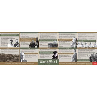 It was supposed to be the war to end all wars. Comprehensive timeline features dates, decisive battles, leaders, pop-culture events, primary source images, and key information about the war that didn’t end all wars but shaped the world we know today. Spark discussions of history, events, causes and the effects of the war, and more with your students.Copyright 2019. 38 x 13 inches, laminated.