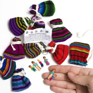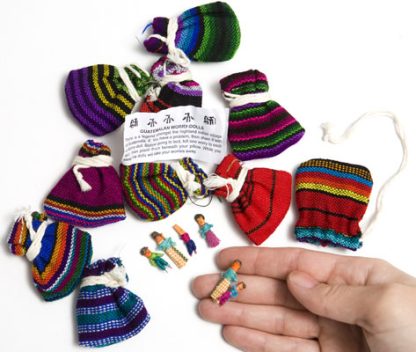 Handmade by native Maya, even the bags are hand-woven! Four to six dolls per bag. Bags are 2 x 2 inches. Dolls are about one inch tall. Made in Guatemala. Handmade! No two are alike!