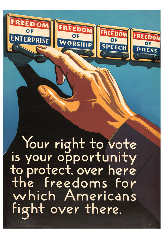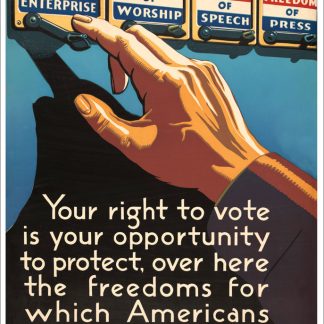 The Works Progress Administration brought us the Federal Art Project and a legacy of stunning graphic images created by artists across the country. Promoting literacy, voting, health, the arts, and more, the posters serve as both art and a primary source of the time they were created. This poster, by Chester Raymond Miller, was created sometime in 1943, during World War II, and reminded citizens of the freedoms gained and supported with a vote at the ballot box as American forces were fighting for freedom on the other side of the world.Copyright 2018. 13 x 19. Cardstock.